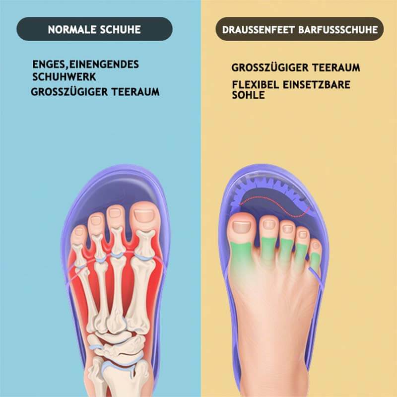 Unsere Draussenfeet‑Schuhe sind sorgfältig für Alltag, Arbeit und Outdoor‑Aktivitäten konzipiert und bieten außergewöhnlichen Komfort und optimalen Halt. Orthopäden und Podologen schätzen ihr ergonomisches Design – ideal, um die Fußgesundheit zu fördern und Beschwerden zu lindern. Gehen Sie mit voller Zuversicht, denn jeder Schritt wird von fachkundiger Fürsorge begleitet – für Ihre Abenteuer und Ihr allgemeines Wohlbefinden.
