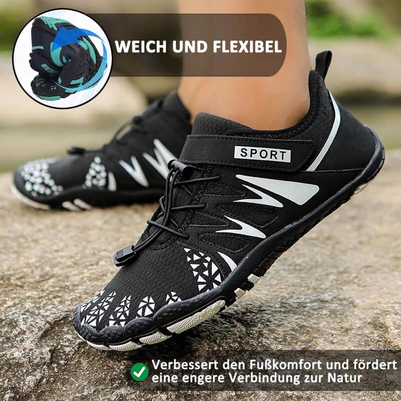 ✓ Breite Zehenbox – Eine großzügige Zehenbox und flexible Konstruktion ermöglichen Ihren Zehen natürliche Bewegungsfreiheit und Spreizung, was Kraft und Flexibilität im Fuß merklich steigert.